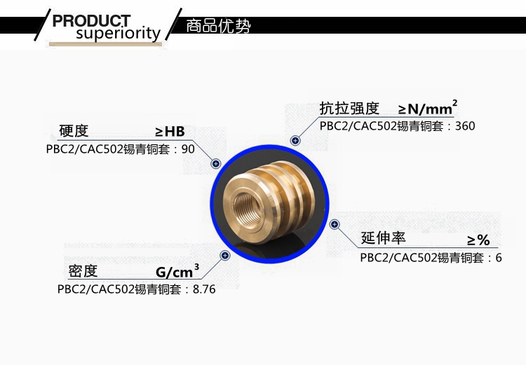 PBC2(CAC502)鑄造錫青銅銅合金硬度高,耐磨性極好,不易產(chǎn)生咬死現(xiàn)象,有較好的鑄造性能和切削加工性能,在大氣和淡水中有良好的耐蝕性,工作溫度可達(dá)260°。PBC2(CAC502)鑄造銅合金可用于高負(fù)荷(20MPa以下)和高滑動速度(8m/s)下工作的耐磨零件,如電動機(jī)軸承、機(jī)床螺紋件、螺母、發(fā)動機(jī)進(jìn)推氣門導(dǎo)套、連桿、襯套、軸瓦、齒輪、蝸輪等。對應(yīng)美國牌號C90700,國標(biāo)ZCuSn10P1