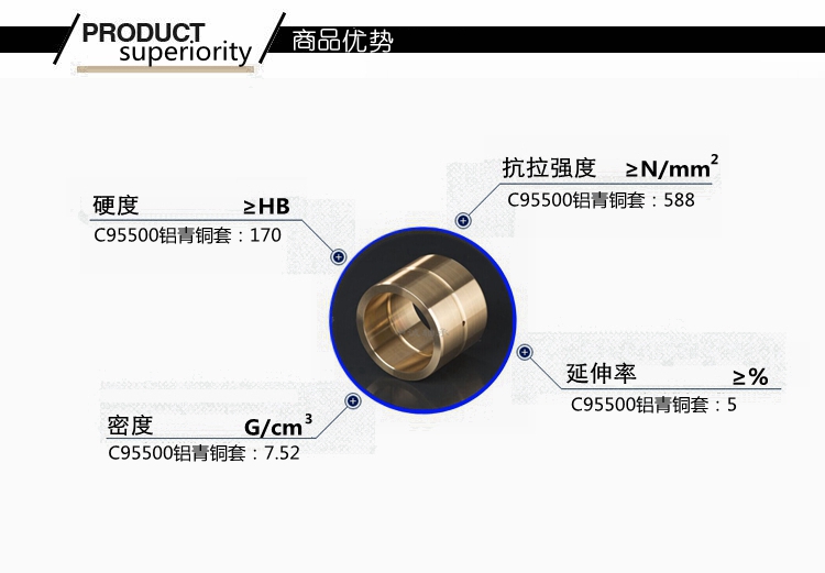 本產(chǎn)品實(shí)行ASTM標(biāo)準(zhǔn)………………………………………………… 根據(jù)客戶(hù)產(chǎn)品需求我們提供的鑄造方式有:離心鑄造,連續(xù)鑄造和金屬型鑄造?!?牌號(hào)C95500合金銅化學(xué)成分:Cu≥78 Fe3-5 Al10-11.5 Mn3.5 Ni3-5.5…………對(duì)比國(guó)內(nèi)相近牌號(hào):ZCuAl10Fe4Ni4