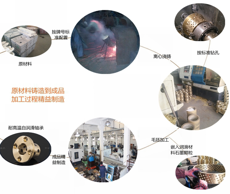 我們根據(jù)使用工況和環(huán)境要求,選擇不同的銅合金材料,如大氣環(huán)境選擇高力黃銅為基體;水環(huán)境下一般選用錫青銅為基體;高溫或海水腐蝕等工作環(huán)境選用鋁青銅為基體;其他特殊工況環(huán)境選擇相應的銅合金材料為基體;然后根據(jù)產品的實際受力情況和運動方式,確定潤滑劑的排布方式和密度,以求達到最佳使用效果和壽命。 銅石墨軸承使用廣泛,如冶金機械,工程機械,注塑機械,水利機械,海工裝備,風電設備,模具行業(yè),印刷包裝機械,礦山設備,石油化工機械,各種輕工機械等等。