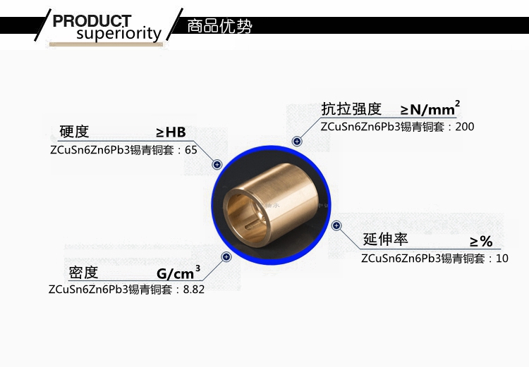 本產(chǎn)品實(shí)行CB883-1986標(biāo)準(zhǔn)………………………………………… 根據(jù)客戶產(chǎn)品需求我們提供的鑄造方式有:離心鑄造,連續(xù)鑄造和金屬型鑄造。…………………………………………………………… 牌號(hào)ZCuSn6Zn6Pb3合金銅化學(xué)成分:Cu余量 Sn5-7 Pb2-4 Zn5-7 Fe0.4 Al0.05 Si0.05 Sb0.3 P0.05